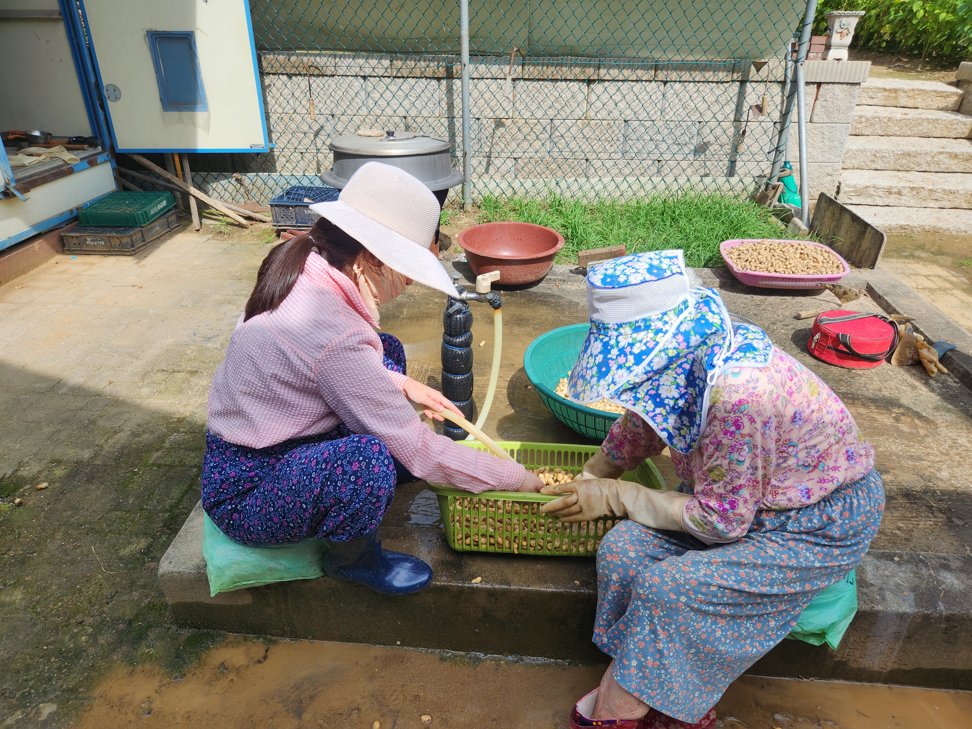 일요일 아침, 땅콩을 캐러 온 가족이 고향집에 내려왔다.